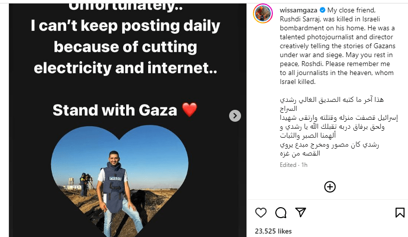 ‘ मेरो नजिकको साथी, रुस्दी सरराज, उनको घरमा इजरायली बम बारीमा मारिए। उहाँ एक प्रतिभाशाली फोटो पत्रकार र निर्देशक हुनुहुन्थ्यो ।’ अन्तर्राष्ट्रिय फोटो पत्रकार विसाम नस्सरले इन्स्टाग्राममा भनेका छन् ।