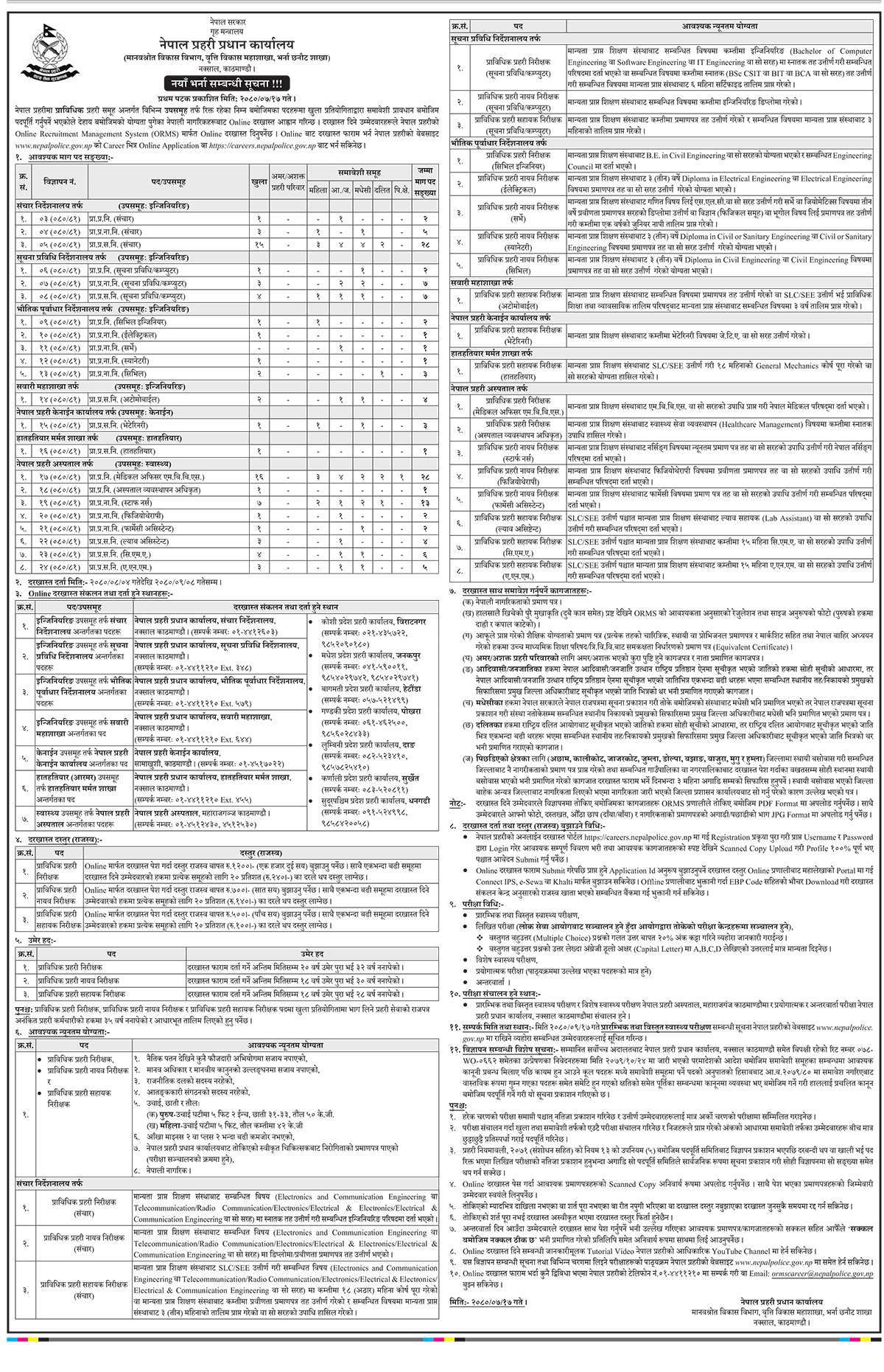 काठमाडौँ, १७ कार्तिक । नेपाल प्रहरीले ठुलो सङ्ख्यामा जागिर खुलाएको छ ।