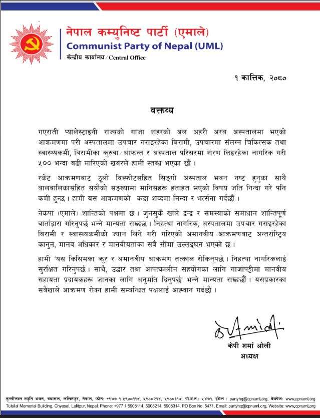 काठमाडौँ, १ कात्तिक । नेकपा एमालेले प्यालेस्टाइनको गाजास्थित अल अहरी अरब अस्पतालमा भएको आक्रमणको निन्दा र भर्त्सना गरेको छ ।