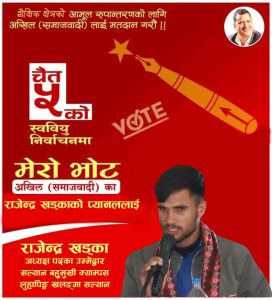 २७ फागुन, सल्यान । आगामी ५ चैतमा हुने निर्वाचनका सल्यानमा दुईवटा छुट्टाछुट्टै गठबन्धन र विप्लव नेतृत्वको नेपाल कम्युनिस्ट पार्टी निकट अखिल समाजवादी एकल प्रतिस्पर्धामा उत्रिएको छ । अखिल समाजवादीले सल्यान बहुमुखी क्याम्पसमा राजेन्द्र खड्का सभापतिका उम्मेदवार छन भने फारुला बहुमुखी क्याम्पसमा निशान देवकोटाले सभापतिमा उम्मेदवार दिएको उक्त संगठन केन्द्रीय सदस्य तथा सभापति पदका उम्मेदवार राजेन्द्र खड्काले जानकारी दिएका छन । दुई गठबन्धन सहित एकल प्रतिस्पर्धामा उत्रिएको अखिल समाजवादीले मंगलबार मनोनयन दर्ता गराएका हाे । अखिल समाजवादी सल्यान जिल्ला समितिले आज एक प्रेस वक्तव्य जारी गर्दै वार्ता संवाद रचनात्मक तालमेलमा खुल्ला रहदै एकल रुपमा चुनाव सहभागी हुने कुरा उक्त संगठनका जिल्ला अध्यक्ष अनिल सी द्वारा हस्ताक्षरित विज्ञप्तिमा उल्लेख्य गरिएको छ । यस्तो छ विज्ञप्तिकाे पुर्ण पाठ